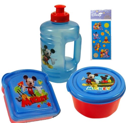 4 Item Mickey Mouse Gift Set: Mickey Mouse Water Bottle Jug, Mickey Mouse Sandwich Box, Mickey Mouse Snack Container, and Winnie the Pooh Stickers Set - All Are BPA Free and Non-toxic