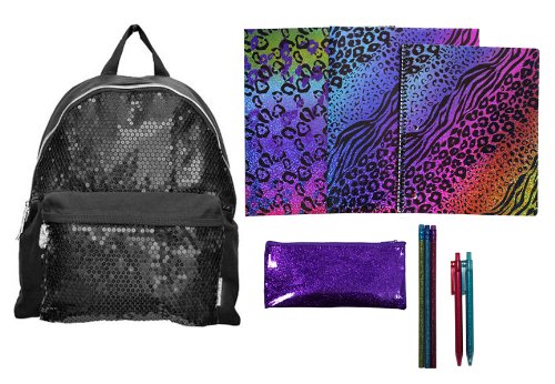 This limited edition Twinkle Toes by Skechers Black Sequin Backpack & ULTIMATE Back to School Set includes 2 Sparkly Jungle Folders (styles may vary), 1 Sparkly Jungle Spiral (styles may vary), 1 Sparkly Purple Pencil Case, 3 Sparkly Pencils (colors may vary), and 2 Sparkly Pens (colors may vary). This is the Ultimate Sequin Back to School set!This Black Sequin Twinkle Toes Backpack features: Shoe charm decorates front zipper pull. Details: 15"H x 12"W x 5.5"D Polyester/cotton Zipper closures