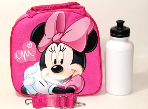 Disney Licensed: Lunch Bag for Kids Girls with Water Bottle & Adjustable Shoulder Strap (Pink MinnieHouse)