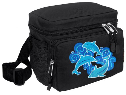 Our tough deluxe DOLPHIN lunch box cooler bag is just the right size for lunch or travel. This well-insulated bag contains a roomy main compartment and a zippered front pocket. Top quality construction with additional convenience features such as a double-zipper wrap-around closure, and an adjustable shoulder strap. This bag also works great as a cosmetic or travel accessories bag! 10.75 x 10.25 x 6.5