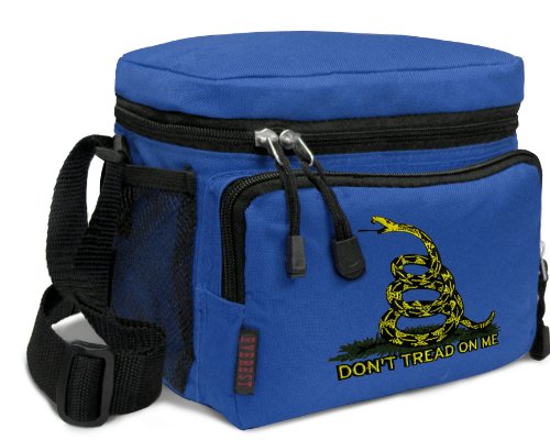 Our tough deluxe Don't Tread on Me lunch box cooler bag is just the right size for lunch or travel. This well-insulated bag contains a roomy main compartment and a zippered front pocket. Top quality construction with additional convenience features such as a double-zipper wrap-around closure, and an adjustable shoulder strap. This bag also works great as a cosmetic or travel accessories bag! 10.75 x 10.25 x 6.5