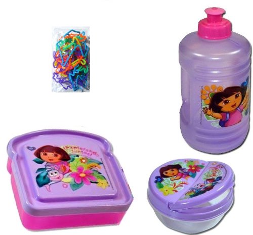 Dora Lunch Gift Set (4 Items): Dora the Explorer Water Bottle, Dora the Explorer Sandwich Box, Dora the Explorer Snack Container (Flip-top), and Bonus Dora Soap-filled Bath Sponge - All Are BPA Free and Non-toxic