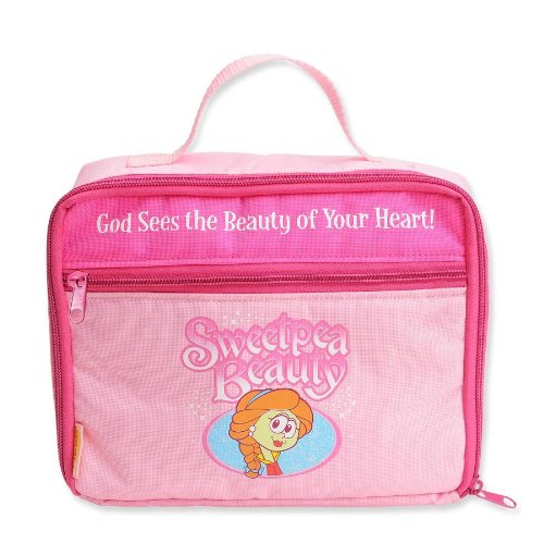 Soft, insulated Veggie Tale lunchbox features Sweet pea Beauty "God sees the beauty of your heart" and includes carrying handle, zip closure and a front zip pocket.