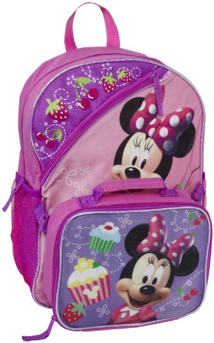 Disney Minnie Mouse 16" full size backpack with detachable insulated rectangular 9" x 7.5" lunch bag. Adjustable padded straps on the backpack for comfort, one large main compartment with zipper closure, additional front zipper pocket, 2 side mesh pockets and top loop handle for eazy hanging.