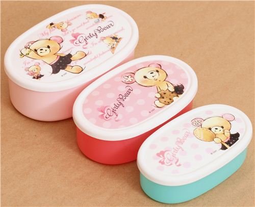 - pink, red & turquoise bento box / lunch box / sandwich box, with cute bear girl, stackable into one another