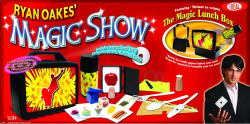 Ideal's Ryan Oakes 101-Trick Magic Show kit includes a magic lunch box, thermal bottle with cup, changing food cards, changing food card box, holey sandwich, 3-piece fork and spoon trick, clean and dry knife, fruit vision reading box, hollow thumb tip, levitating tool, disappearing cloth napkin, handkerchief vanisher and instructional magic trick DVD starring magician Ryan Oakes.