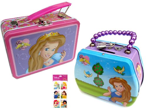 Princess Toys (Set of 3) - Princess Bank Purse for Girls with Lock and Key (5"x3"x3"), Princess Tin Lunch Box (Mini - 5.5"x4"x3"), and Disney Princess Stickers (4 Sheets 3"x6") - Assorted Colors - Great Stocking Stuffers for Girls - Stickers feature Ariel, Snow White, Belle, Jasmine, Cinderella and Little Mermaid