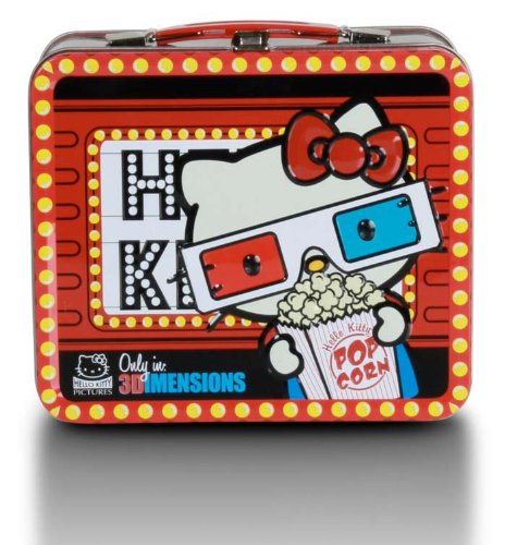 Get ready to go back to school with your favorite friend, Hello Kitty!Perfect for storing your lunch, fill this delightful retro-style Hello Kitty metal lunch box with your favorite foods. On the outside, Hello Kitty is ready for some fun at a 3D movies with her funky 3D eyeglasses and bag of yummy popcorn.You can also use this metal lunch box with printed and embossed graphics as a small purse, too!