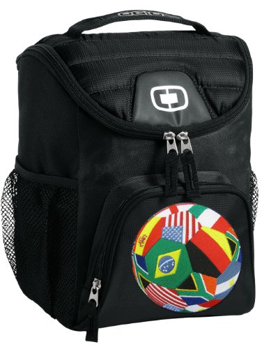 Our tough deluxe World Flag Soccer Ball lunch box cooler bag is just the right size for lunch or travel. This well-insulated bag features a roomy, zippered, main compartment that holds 6-12 twelve oz. cans and a zippered front pocket. Top quality construction with additional convenience features such as a double-zipper wrap-around closure, extra long Easy-Grab zipper pulls, and to more side mesh pockets. This bag also works great as a cosmetic or travel accessories bag! 10.5 x 8.5 x 7